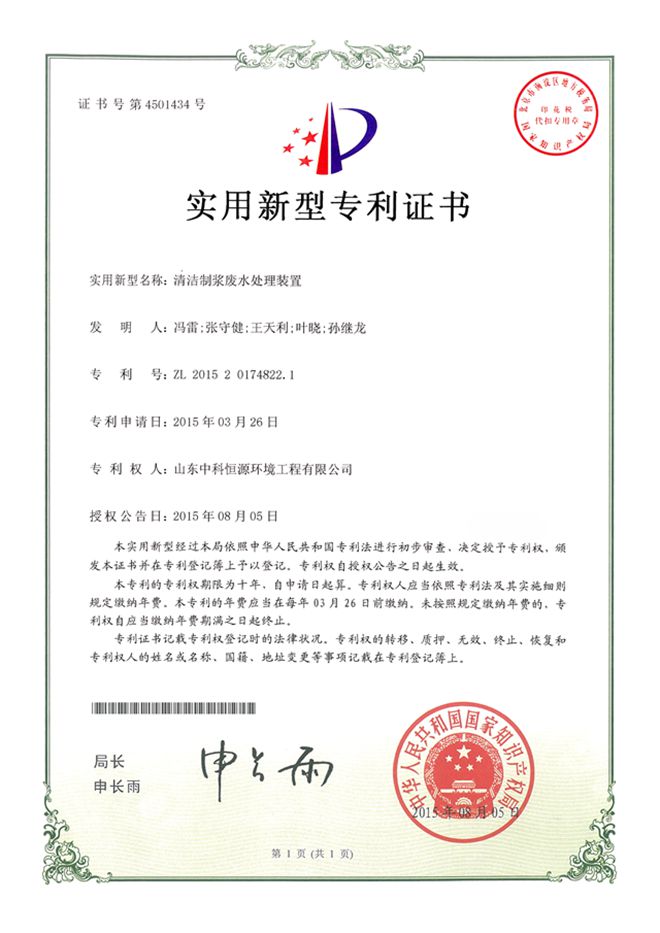 我司申请的“清洁制浆废水处理装置”于2015年8月5日获得国家知识产权局颁发的实用新型专利证书。